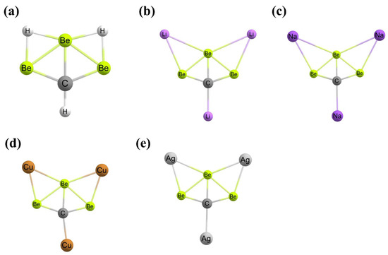 The global minimum structures of (a) CBe3H3+, (b) CBe3Li3+, (c) CBe3Na3+, (d) CBe3Cu3+, and (e) CBe3Ag3+ clusters.