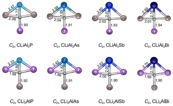 Optimized ptC global minimum structures of C2v CLiAl2E and CLi2AlE (E = P, As, Sb, Bi) at B3LYP/C, Li, Al, P, As/aug-cc-pVTZ/Sb, Bi/aug-cc-pVTZ-pp levels. Bond distances are in Å.