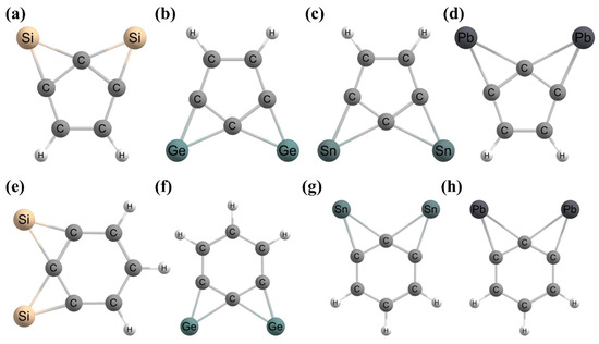 The optimized structures of cyclic aromatic hydrocarbons (a) Si2C5H2, (b) Ge2C5H2, (c) Sn2C5H2, (d) Pb2C5H2, (e) Si2C6H3+, (f) Ge2C6H3+, (g) Sn2C6H3+, and (h) Pb2C6H3+ clusters.