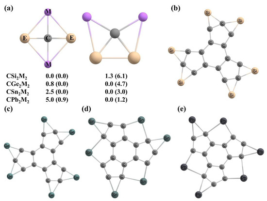 (a) The structure and relative energies (kcal mol−1) of the global minima and second stable isomers of CE2M2 (E = Si–Pb, M=Li, and Na) at the CCSD(T)/def2-TZVP level. The values without and within parentheses correspond to clusters with Li and Na, respectively. The lowest energy structures of (b) Si6C15, (c) Ge6C15, (d) Sn6C15, and (e) Pb6C15 systems.