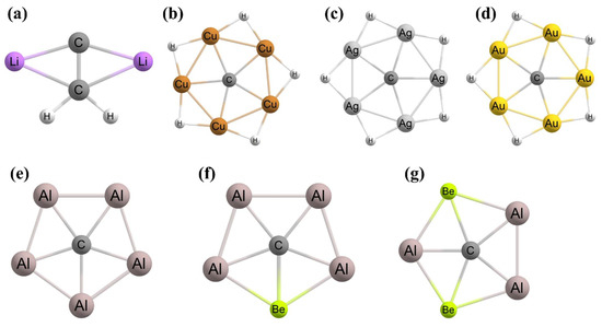 - Wu, Y.B.; Duan, Y.; Lu, H.G.; Li, S.D. CAl2Be32– and its salt complex LiCAl2Be3–: Anionic global minimawith planar pentacoordinate carbon. J. Phys. Chem. A 2012, 116, 3290–3294. [Google Scholar] [CrossRef] [PubMed]