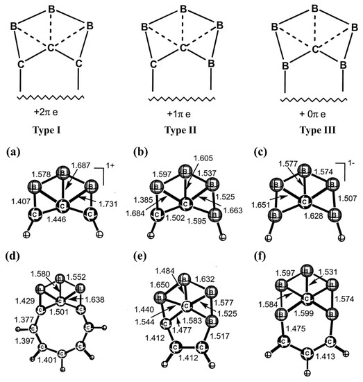Wang and Schleyer suggested the design principles of “hyparenes” and reported a family of systems with ppC using density functional theory (DFT)-based computations [102]. They predicted that it is possible to construct “hyparenes” with the replacement of the –(CH)3– groups in aromatic and/or antiaromatic hydrocarbons by three borocarbon units with ppCs –C3B3– (Type I), –C2B4– (Type II), and –CB5– (Type III) (Figure 19). The uncommon geometries of the hyparenes can offer unique characteristics that are of use to compose new materials. The hyparenes correspond to the low-lying local minima with normal C–B, B–B, and C–C bond distances. The partial σ and partial π bonds to the planar pentacoordinate carbons contributed to the multicenter bonding in the hyparenes. After the detection of the aromatic M5(μ-H)5 hydrometal rings (M = Cu, Ag, Au) [103,104], Li et al. placed one carbon atom at the center of the Cu5(μ-H)5 ring and found a perfect D5h symmetric true local minimum structure with a ppC (Figure 18b) [105]. Although the Cu5(μ-H)5 ring is aromatic in nature, the inclusion of the carbon causes the nonaromaticity of the ring. Further, the Ag5H5C (Figure 18c) and Au5H5C (Figure 18d) molecules also have a ppC in their local minimum geometries [106].