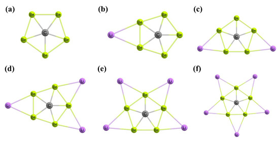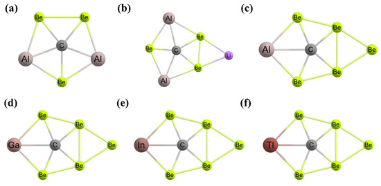 The global minimum energy structures of (a) CAl2Be32−, (b) LiCAl2Be3−, (c) CBe5Al−, and (d) CBe5Ga− clusters. The local minimum structures of (e) CBe5In− and (f) CBe5Tl− clusters.