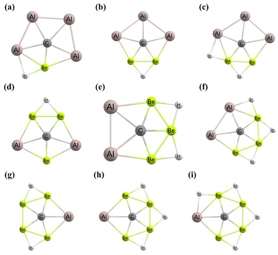 Optimized structures of (a) CAl4BeH4+, (b) CAl3Be2H, (c) CAl3Be2H2+, (d) CAl2Be3H−, (e) CAl2Be3H2, (f) CAl2Be3H3+, (g) CAlBe4H2−, (h) CAlBe4H3, and (i) CAlBe4H4+ clusters.