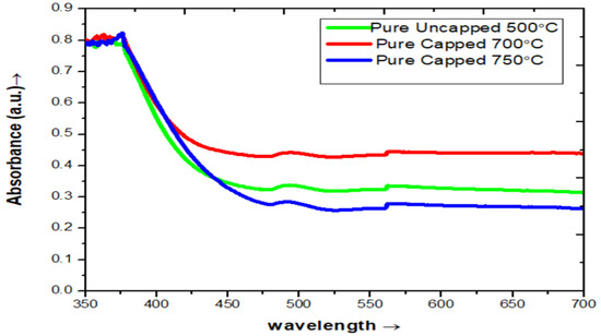 UV-vis. absorption spectrum of pure and capped ZnO nanopowder with different temperatures.