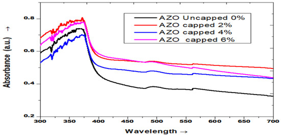 The size of the nanopowder plays an important role in changing the properties of materials. Thus, the size evolution of semiconducting nanopowder becomes very essential to exploring the properties of the materials. For the optical properties of nanopowder, the UV-visible absorption spectroscopy technique is used to examine synthesized ZnO and capped AZO nanopowder. The absorption spectrum of ZnO nanopowder is shown in Figure 1. It exhibits a strong absorption band at about 355 nm [34]. Figure 1 shows the optical absorption spectra of ZnO in the wavelength range of 350 to 700 nm. It is observed that the absorbance increases when the nanopowder is capped, and then its absorbance further decreases when annealed at a higher temperature. This event can be related to structural properties in the solid with great reductions in particle size. When the size of the particle is small, the ratio of the atoms on the surface to all the atoms in the particle increases. In this situation, the surface atoms can affect the morphology [38].