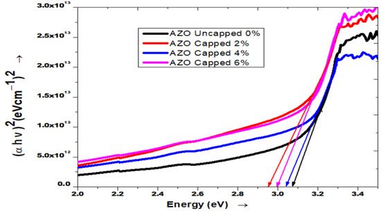 In addition, the increase in the carrier concentration with high annealing temperatures implies that more Al atoms diffuse into the ZnO layer and replace some of the Zn2+ sites at elevated temperatures. When the annealing temperature and concentration is increased, the process would result in the precipitation of AlOx and consequently decrease the carrier concentration [40] as the absorption edge shifted to higher wavelengths, as shown in Figure 3. In Table 2 it is enumerated that the crystallite size of undoped ZnO is 35.05 nm, which decreases to 24.03 nm in the 2% (capped) Al-doped nanopowder. An increase in crystallite size on Al doping arises due to a reduction in the densities of nucleation centers and the consequent growth of large crystallites [41]. However, on further doping, the crystallite size begins to decrease and becomes 18.89 nm for 6% Al-doped nanopowder. This is because of the decreased sintering rate that occurred during the sol-gel process [42]. The direct optical band gap (Eg) of the materials is obtained by the plotting and extrapolation of (αhv)2 vs. hν; the band gap energy estimated from the absorption fringe of the nanopowder is shown in Figure 4. It is clear from the figure that uncapped AZO 0% nanopowder encompasses a band gap of 3.10 eV at 500 °C, and capped AZO 2% nanopowder encompasses a band gap of 3.02 eV at 500 °C; it also increases to 3.08 eV and 3.09 eV with the Al dopants of 4% and 6%, respectively.
