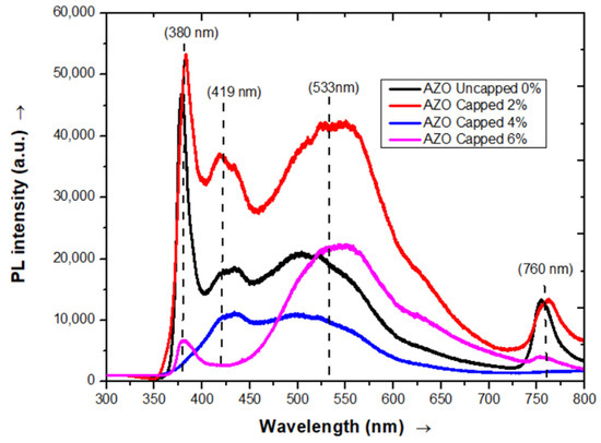 The PL properties of various kinds of AZO nanostructures demonstrated a relative intensity emission between the UV-visible emission, and therefore the point defects like oxygen deficiency within the crystalline structure of the fabric. This relative intensity is often observed in PL measurements. Figure 6 shows the photoluminescence spectra of AZO nanopowder, deposited at 500 °C, with capping and different atomic concentrations. Thus, to enhance the luminescence within the visible region, aluminum as a doping agent with different atomic concentrations (0%, 2%, 4%, and 6%) has been used in this study. Our aim is to optimize Al3+ ion concentration in the AZO sample. We have noted that by adding aluminum, there is a change in the photoluminescence PL peak intensity. The PL spectrum obtained for the pure and capped AZO nanopowder with different Al concentrations shows four main emissions at λ = 380, 419, 533, and 760 nm. The UV emission peak at 380 nm corresponds to the near band-edge (NBE) emission of AZO, and is thanks to the radiative recombination of free excitons [50]. The intensity of UV emission was found to decrease with the concentration of aluminum, and may be associated with the decrease in the size of the particles, beyond which intensity diminishes. Size reduction causes more atoms to be closer to the surface and thereby increases the speed of trapping of photo-generated holes at the surface, which successively enhances the emission intensity [51].