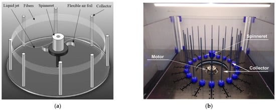 Schematic diagram of (a) centrifugal spinning (Reprinted with permission from Ref. [18]. 2013 Elsevier) and (b) the equipment (Reprinted with permission from Ref. [14]. 2016 Elsevier).
