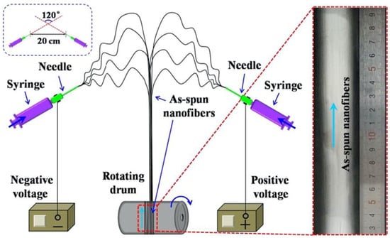 Besides centrifugal spinning, electrospinning is also a widely used method utilized for the fabrication of nanofibers [19,20]. Figure 2 and Figure 3 show a schematic of an electrospinning process for manufacturing nanofibers [21,22]. Usually, a high-voltage electrical field is built between the nozzle and collector. Nanofibers formed at the nozzle owing to a much higher electrostatic force than the liquid jet’s surface tension. During the spinning, nanofibers are formed after the evaporation of the solvents. The ultrafine nanofibers are finally obtained on the collector, including organic nanofibers and Al2O3 nanofibers. Electrospinning is a typical method for nanofiber preparation, and it contains at least three typical steps: (1) preparation of a spinning solution consisting of precursors; (2) solution spinning under an electric field; and (3) calcination at high temperatures to obtain the inorganic nanofiber. Therefore, the advantages of electrospinning include structure and morphology control simply by adjusting the spinning parameters such as the composition of the spinning solution, electric field, and calcination conditions.