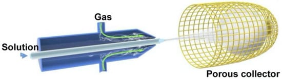 Solution blow spinning is a simple procedure compared to electrospinning as shown in Figure 5, which makes it popular for the fabrication of nanofibers [25,26,27,28]. Compared to electrospinning, the solution blow spinning is high-voltage-free and it works with the high-speed gas flow as the driving force, thus it draws more attention for possessing a higher spinning efficiency.