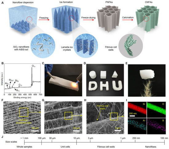 Fabrication process of SiO2 nanofiber aerogel (CNFAs) (A) Schematic illustration of the fabrication of CNFAs. (B) XPS spectrum of CNFAs for all elements; a.u., arbitrary unit. (C) A CNFA heated by a butane blowtorch without any damage. (D) An optical image of CNFAs with diverse shapes. (E) An optical image showing a 20 cm3 CNFA (r = 0.15 mg·cm−3) standing on the tip of a feather. (F–H) The microscopic structure of CNFAs at different magnifications demonstrates the hierarchical nanofibrous cellular architecture. (I) STEM-EDS images of a single nanofiber with corresponding elemental mapping images of Si, O, Al, and B, respectively. (J) Schematic showing the three levels of a hierarchy of the relevant structures. (Reprinted with permission from Ref. [5]).