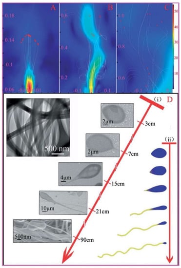 Fiber forming mechanism via high-pressure gas spinning. (A–C) show the particles’ track after they had moved for 0.005, 0.075 and 0.12 s, respectively. (D) Proposed mechanism to explain the formation of nanofibers in the extrusion spray spinning process. (i) Scanning electron micrographs of the PVP nanofiber (or droplet) collected at different locations from 3 to 90 cm away from the spray nozzle. The inset is a transmission electron micrograph of the PVP nanofibers collected 180 cm away from the spray nozzle. (ii) Schematic illustrations showing the development from the original PVP droplets to PVP nanofibers. (Reprinted with permission from Ref. [29]. 2012 Royal Society of Chemistry).