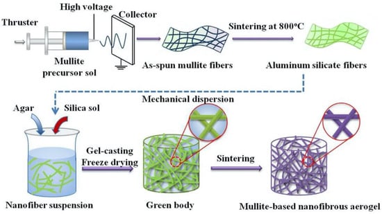 - Liu, R.; Dong, X.; Xie, S.; Jia, T.; Xue, Y.; Liu, J.; Jing, W.; Guo, A. Ultralight, thermal insulating, and high-temperature-resistant mullite-based nanofibrous aerogels. Chem. Eng. J. 2019, 360, 464–472. [Google Scholar] [CrossRef]