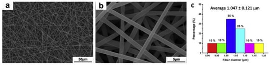 The morphology of the electrospun SiOC fibers after being calcined at 1000 °C (a) the low resolution and (b) the high resolution; (c) the diameter distribution of the electrospun SiOC fibers after calcined at 1000 °C (Reprinted with permission from Ref. [71]. 2018 Elsevier).