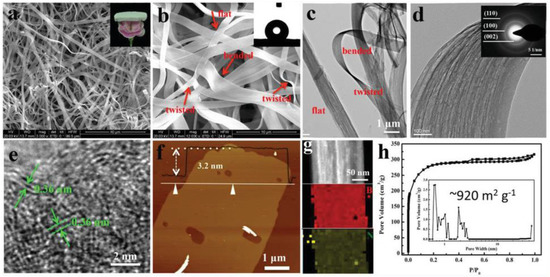BN nanofibers: (a,b) SEM images, (c–e) TEM images, (f) an AFM image of BN nanoribbon aerogel, (g) STEM and element mappings of single BN nanoribbon, and (h) nitrogen adsorption–desorption isotherms of BN nanoribbon aerogels. Inset in (a), a BN nanoribbon aerogel monolith was placed on a flower. Inset in (b), the contact angle of BN aerogel. Inset in (d), the corresponding electron diffraction pattern. Inset in (h), the corresponding pore size distribution curve. (Reprinted with permission from Ref. [30]. 2019 WILEY-VCH Verlag GmbH & Co,. KGaA.)