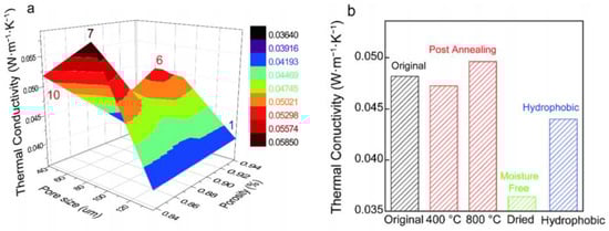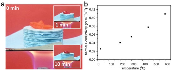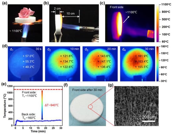 Liu et al. [78] used co-axial electrostatic spinning to prepare nitrogen-doped hollow silicon carbide fiber mats, in which PMMA was used as a sacrificial template to stabilize and pyrolyze the PCS/PMMA precursor. The cavity wall thickness of the hollow fiber was approximately 1.5 μm, while the mats possessed low density (0.218 g·cm−3), high thermal conductivity (0.039 W·m−1·K−1), good flexibility and thermal stability. The properties of the mats suggest promising application as high-temperature thermal insulators. Dou et al. [81] synthesized a layered cellular structured silica nanofiber aerogel with adjustable density below 10 mg·cm−3, excellent thermal insulation property with thermal conductivity of 0.029 W·m−1·K−1, and ultra-low dielectric constant due to the high porosity of NBAs. The aerogels showed excellent refractoriness and high-temperature resistance, as exhibited in Figure 14.