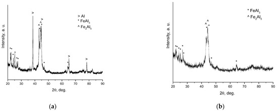 XRD patterns of the composites obtained by SPS of Al–20 vol.% Fe66Cr10Nb5B19 (a) and Al–50 vol.% Fe66Cr10Nb5B19 (b) mixtures. SPS conditions: temperature—570 °C, holding time—3 min, applied pressure—40 MPa.