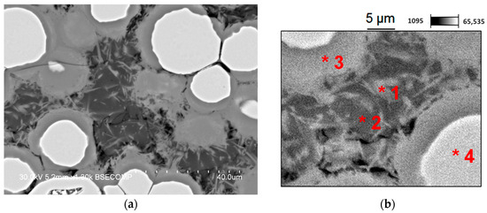 An area of the cross-section of the composite obtained by SPS of Al–50 vol.% Fe66Cr10Nb5B19 (a). SPS conditions: temperature—570 °C, holding time—3 min, applied pressure—40 MPa. The points (1, 2, 3 and 4) in which the energy dispersive spectroscopy (EDS) analysis was conducted are marked in (b). BSE images.