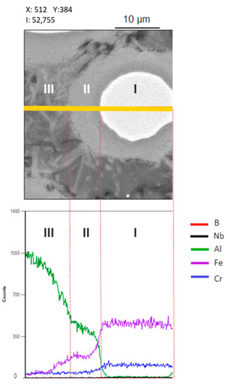 Figure 4 shows the results of the EDS analysis along a line crossing a particle core (region I), a shell of the reaction products (region II) and a residual matrix region (III). This analysis helps visualize the concentration changes along a line crossing two interfaces. The material in region I did not contain Al. In region II, Al, Fe and Cr were present. The presence of iron was also detected beyond the particle shell (region III). Signals coming from boron and niobium were very weak and were at the background level.
