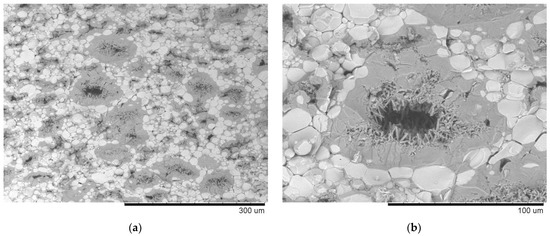 In Figure 1b, pores can be seen between the particles of the core–shell structure, which implies that the diffusion of the aluminum into the alloy occurred faster than the diffusion of the alloy components into the aluminum. In order to obtain further confirmation of the preferential diffusion of the aluminum into the alloy particles, sintering of an Al–70 vol.% Fe66Cr10Nb5B19 mixture was carried out. A low concentration of aluminum in this mixture allowed us to obtain a structure in which the Al particles were surrounded by the metallic glass matrix. An Al powder with particles larger than those of the metallic glass was used for the preparation of the mixture. This allowed us to distinguish pores formed due to the Kirkendall effect and those formed because of the incomplete sintering of the glass particles by their size. Figure 6 demonstrates the fracture surface of the sintered material fabricated from the Al–70 vol.% Fe66Cr10Nb5B19 mixture. In this material, Al fully transformed into the intermetallic phases, as confirmed by the XRD analysis (Figure 7). The pores formed in locations of the Al particles throughout the compact (Figure 6a). It is seen that the walls of the pores were covered with needles (Figure 6b).