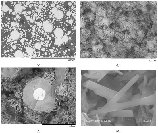 The formation of pores can be better traced if the compacts are heated without the application of pressure. The composite spark plasma sintered from the Al–20 vol.% Fe66Cr10Nb5B19 mixture (Figure 8a) was annealed in a furnace at 620 °C for 2 h. After SPS, no reaction product was present in the material, as confirmed by the XRD (Figure 9a). The fracture surface of the material formed after annealing is shown in Figure 8b. It is seen that the material was porous and was composed of nearly spherical particles surrounded by platelets and needle-shape crystals. In some cases, the core of the alloy particle was partially preserved (Figure 8c). The morphology of the needle-shape crystals present in the pores is shown in Figure 8d. As seen in the XRD pattern in Figure 9b, aluminum reacted with the alloy to form the FeAl3 and Fe2Al5 phases.