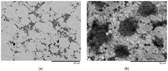 (a) Microstructure of the material obtained by SPS of Al-Fe (4:1 mol.) mixture. Al powder 3–10 μm. SPS conditions: temperature—570 °C, holding time—3 min, applied pressure—40 MPa. (b) Fracture surface of the material obtained by HP of the Al-Fe (3:2 mol.). Al powder 3–30 μm. HP conditions: temperature—650 °C, holding time—5 min, applied pressure—3 MPa. BSE images.