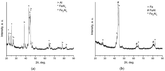 (a) XRD pattern of the material obtained by SPS of Al-Fe (4:1 mol.) mixture. SPS conditions: temperature—570 °C, holding time—3 min, applied pressure—40 MPa. (b) XRD pattern of the material obtained by HP of the Al-Fe mixture (3:2 mol.). HP conditions: temperature—650 °C, holding time—5 min, applied pressure—3 MPa.