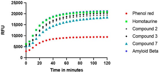 The in vitro anti-aggregation of the amyloid-beta (1–42) peptide was conducted with all compounds initially at 100 µM and incubated at 37 °C, in the presence of Thioflavin T (200 µM) over 120 min. Homotaurine itself did not significantly affect the aggregation, while our positive control (Phenol red) showed a significant decrease over 2 h (Figure 2). Unfortunately, none of the sulfonamide derivatives showed any noticeable effect on the aggregation of the Aβ peptide. In fact, the kinetic curves of all synthesized sulfonamides were similar to the homotaurine and, at the same time, similar to the peptide without the inhibitor (Figure 2), thus, the IC50 values could only be estimated as >100 μM (Table 1).