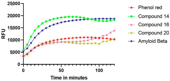 Select ThT fluorescence assay of chalcone compounds 14, 16, and 20 at 100 µM. Phenol red 100 µM is a positive control. Fluorescence was recorded every 5 min for 120 min.