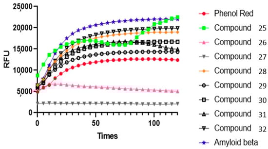 ThT fluorescence assay. Select extended chalcone compounds (25–32) at 100 µM with Phenol red (100 µM) as a positive control. Fluorescence was recorded every 5 min for 120 min.