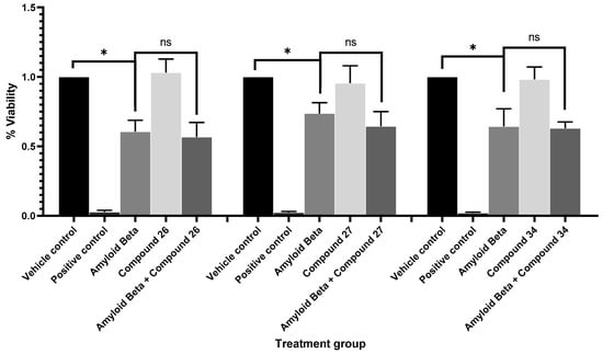 Amyloid beta alone significantly decreases cell viability in SH-SY5Y cells with compounds 26, 27, and 34 (at IC50 concentrations), providing no significant neuroprotection. Cell viability was measured as an MTT reduction, and data ± SEM (n = 3) were normalized as % vehicle control (black column). Asterisk (*) indicates significant difference from vehicle controls as determined by one-way ANOVA followed by Tukey’s post hoc test (p < 0.05); ns, not significant.