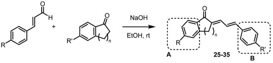 Curcumin’s extended conjugation (specifically in its enol tautomeric form) inspired us to extend our chalcone derivatives. We synthesized a diversity of extended chalcones with different substitution patterns as well as the inclusion of some with fused ring systems (31–33) via the condensation of an acetophenone and a cinnamaldehyde (Scheme 3). A noticeable improvement in anti-amyloidogenic profiles for those possessing a 4-dimethylamino group on ring B was observed (Figure 4).