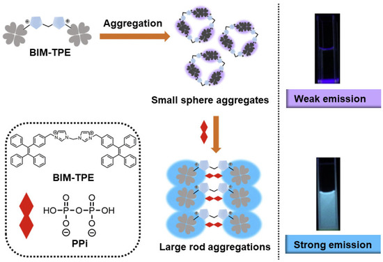 - Li, C.-T.; Xu, Y.-L.; Yang, J.-G.; Chen, Y.; Kim, H.S.; Cao, Q.-Y.; Kim, J.S. Pyrophosphate-triggered nanoaggregates with aggregation-induced emission. Sens. Actuators B 2017, 251, 617–623. [Google Scholar] [CrossRef]
