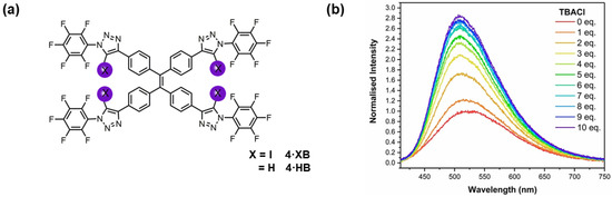 - Docker, A.; Shang, X.; Yuan, D.; Kuhn, H.; Zhang, Z.; Davis, J.J.; Beer, P.D.; Langton, M.J. Halogen Bonding Tetraphenylethene Anion Receptors: Anion-Induced Emissive Aggregates and Photoswitchable Recognition. Angew. Chem. Int. Ed. 2021, 60, 19442–19450. [Google Scholar] [CrossRef]