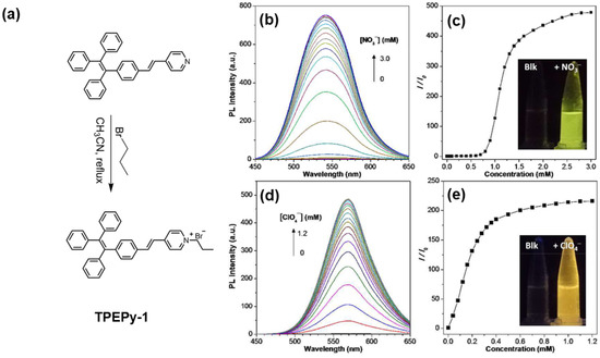 - Li, N.; Liu, Y.Y.; Li, Y.; Zhuang, J.B.; Cui, R.R.; Gong, Q.; Zhao, N.; Tang, B.Z. Fine Tuning of Emission Behavior, Self-Assembly, Anion Sensing, and Mitochondria Targeting of Pyridinium-Functionalized Tetraphenylethene by Alkyl Chain Engineering. ACS Appl. Mater. Interfaces 2018, 10, 24249–24257. [Google Scholar] [CrossRef]
