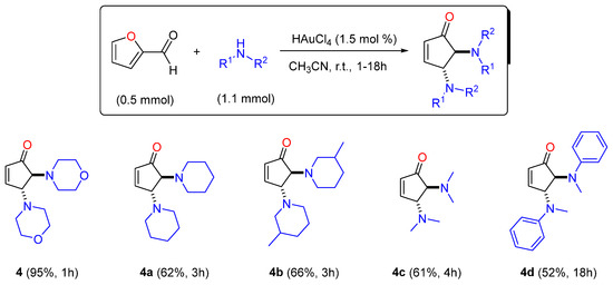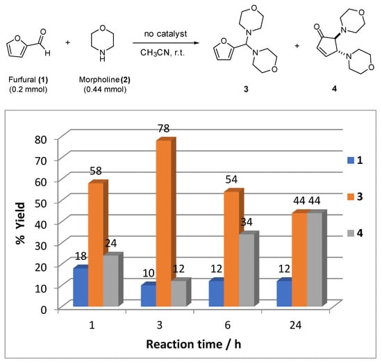 To optimize the reaction conditions, furfural (1) and morpholine (2) were selected as model substrates for the synthesis of the desired trans-4,5-dimorpholinocyclopent-2-enone 4 (Table 1). First, control experiments using 3 mol% HAuCl3 in different solvents were tested and the results are summarized in Table 1. Among the used solvents, acetonitrile was found to promote the studied transformation within 1 h and with quantitative formation of the desired product 4 (Table 1, entry 1). In the presence of other polar solvents, such as EtOAc, MeOH, EtOH, or the less-polar DCM, DCE, CHCl3, or even non-polar toluene, a mixture of aminal 3 and the product 4 were observed in different ratios (Table 1). Similar results were also observed in the absence of a catalyst and over a prolonged period of time (18 h) in several solvents (Table S2). Only protic solvents MeOH and EtOH and polar DMF were found to promote the studied transformation over a prolonged period of time, leading to a mixture with the desired 4 as the major product (Table S2 entries 2, 3, and 13). For comparison, the reaction profile was also studied in the absence of HAuCl4 and in CH3CN as the chosen solvent. The absence of a catalyst, and at a prolonged reaction time of 18 h, revealed the formation of a mixture of aminal 3 and the 4; however, no reaction completion was observed (Figure 1). The structure of 3 was determined by NMR and compared with the literature data [].