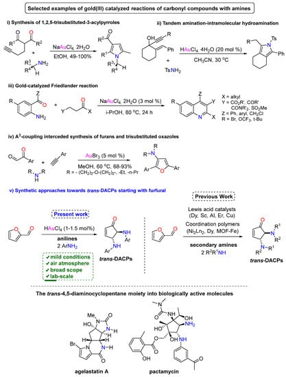 (Upper) Gold(III)-catalyzed organic transformation in the presence of amines. (Lower) Gold(III)-catalyzed transformation of furfural into trans-DACPs.