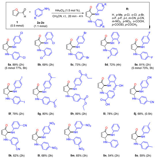 With these encouraging results, we further examined the possible application of the present optimum conditions using substituted anilines (1.1 mmol) instead of secondary amines. As far as we know, only aniline was used in sporadic examples for the synthesis of the corresponding trans-DACPs; however, low yields were reported. Only polyoxometalates were reported to successfully drive the conversion of furfural to the corresponding trans-DACPs in the presence of anilines []. Thus, a series of substituted anilines (1.1 mmol) were studied in the presence of 0.5 mmol of furfural in 0.5 mL of CH3CN at room temperature. Indeed, under the proposed conditions, a series of substituted trans-DACPs (5a–5o) were synthesized and isolated in moderate to high isolated yields of 54–89% (Scheme 3). More specifically, substituted anilines with electron withdrawing groups (5a–5m) were found to lead the reaction in higher yields; however, the corresponding aniline and p-toluidine derivatives were formed in lower yields (5n, 54% and 5o, 59%). In addition to this observation, the m-NO2-substituted aniline reacted in lower yields than the corresponding p-NO2 aniline, leading to the desired trans-DACPs 5l and 5m of 68% and 65%, respectively. It is interesting to note that 5a and 5e were also synthesized at the 5 mmol lab-scale and were isolated in 77% and 73% yields, respectively, in the presence of 3 mol% of HAuCl4 and in 3 mL of CH3CN (Scheme 3, values in parentheses).