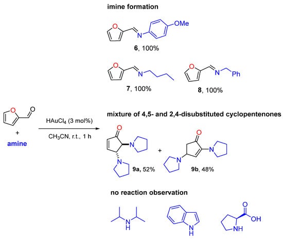 It is worth noting that p-MeO-aniline (pKb~8.6) does not lead to the desired cyclopentanone derivate; however, the corresponding imine 6 was formed quantitatively (Scheme 4). Accordingly, using the primary aliphatic amine n-butylamine (pKb~3.2) and benzylamine (pKb~4.6), the corresponding imines 7 and 8 were observed as the only product, even at the prolonged reaction time (18 h) (Scheme 4). It is noting that, in the presence of pyrrolidine, an equimolar mixture of the desired trans-4,5-N,N-disubstituted cyclopent-2-en-1-one 9a and the thermodynamic 2,4-disusbtituted cyclopentenone 9b was observed; however, no reaction process was observed in the presence of diisopropylamine, 1H-indole, or L-proline (Scheme 4). Based on these results, it seems that the protocol was applied to anilines and secondary amines with pKb higher than ca. 9.