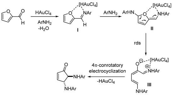 From a mechanistic point of view, during the present catalytic conditions, the oxophilic Au(III) complexes mediated the initial formation of I and the further transformation to intermediate II (Scheme 6). The nucleophilic attack of the amine to the 3-position of the cyclopentenone core of II led to the formation of Stenhouse salt intermediate III, which subsequently transformed to the final product through a 4π-conrotatory electrocyclization pathway with the exclusive trans-diastereoisomer (trans-DACPs) (Scheme 6). This plausible pathway is in agreement with the literature reports in which the corresponding Stenhouse salt, derived by the reaction of furfural with aniline, was isolated and characterized by XRD []. It is worth noting that no reaction process was observed by 1H NMR when 5-methylfurfural was mixed with 4-chloroanilne, a result that further supports the proposed mechanism.