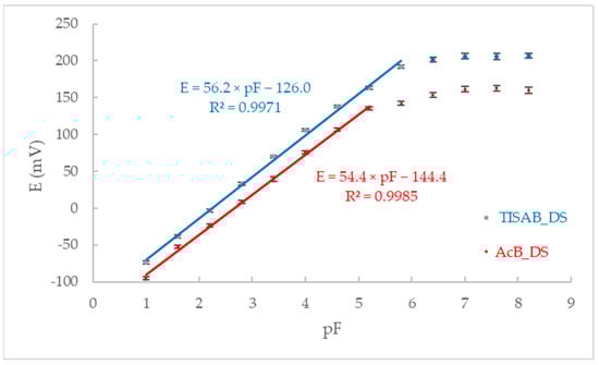 Calibration curves for fluoride ions in experiments performed in AcB_DS and TISAB_DS using commercial FISE.