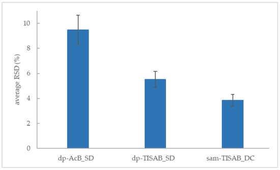 However, considering that the average values of RSD of direct potentiometry (5.51%) are 43.1% higher than those of the standard addition method (3.85%), it is clear that the latter provides more accurate and precise results (Figure 3). As such, it can be proposed for the determination of fluoride. The different mean values for fluoride concentration obtained with dp-AcB_DS or sam-TISAB_DS are due to the fact that the fluoride concentrations in the wines are at the sensitivity limit of the electrode and it was expected that the addition of standards would be more precise and therefore more accurate due to the shift in the sensitivity limit.