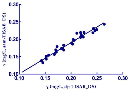 A statistical comparison was also made between the results obtained with dp-TISAB_DS, i.e., with the standard addition method in the TISAB dilution solution (sam-TISAB_DS) using Pearson’s correlation analysis. It showed a positive significant correlation between the fluoride content determined by these two methods (r = 0.98, p < 0.0001, Figure 4).