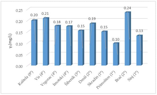Since there was no difference between the fluoride contests in the tested red and white wines, Figure 5 shows the average fluoride content from 10 different Dalmatian areas.