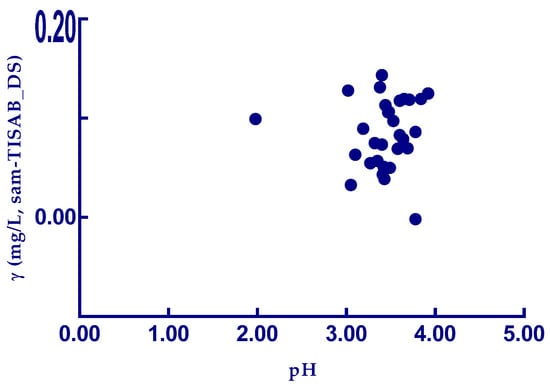 Since small changes in pH significantly affect the sensory characteristics and stability of wine [38,39], in this work the pH of wine samples studied was determined. If the pH of sample W5 (Rukatac, Vrgorac) was disregarded, which is significantly different from all Dalmatian white and red wines studied, significant difference in pH values was found between none of them. The highest pH of 3.84 was measured in the red wine of the Babica variety from the Kaštela area, while the lowest pH of 1.98 was measured in the white wine of the Rukatac variety from the Vrgorac area. The average pH of all wines was 3.43 ± 0.34. As can be seen from Figure 6, Pearson’s correlation analysis showed that there is no significant correlation between pH and fluoride content in the tested wine samples (r = 0.04).
