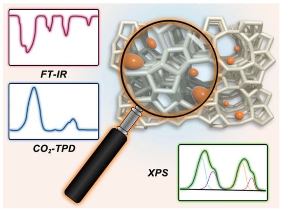 Basic sites in zeolites are the active centers for transesterification reactions. An in-depth understanding of the chemical states and the locations of basic sites in zeolites is essential to design more efficient basic zeolite catalysts for transesterification reactions. Various characterization techniques, such as temperature-programmed desorption (TPD), infrared spectroscopy (IR), nuclear magnetic resonance (NMR), and X-ray photoelectron spectroscopy (XPS) have been extensively employed to gain deeper insights into the characteristics of basic sites in zeolites [56]. Herein, some representative characterization techniques that can monitor the zeolite basicity will be briefly introduced in the following content (Figure 2).