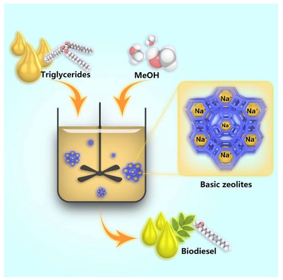 Future research for the development of basic zeolite catalysts for biodiesel production by transesterification could focus on the following areas: (1) fabrication of hierarchical basic zeolites that integrate intrinsic micropores with mesopores and/or macropores to improve mass transfer and molecular accessibility; (2) preparation of nanosized or 2D basic zeolites, where the content and distribution of basic sites can be well regulated; (3) developing one-pot synthesis strategies of basic zeolites to promote the stability and intensity of basic sites; (4) designing hydrophobic zeolites with grafting methods using silane reagents; (5) synthesizing a proto-zeolite with a partially formed structure, which possesses a large external surface area and short-range order, but more open pores; (6) carefully designing bifunctional catalysts endowed with acid–base functions, which are capable of esterifying the free fatty acids on acid sites and transesterifying the triglycerides on the basic sites for raw oil feedstocks.
