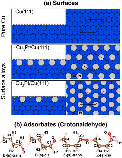 Lastly, many adsorbates require multiple-atom ensembles to bind to the surface, and new combinations of those become available in bimetallic NPs [44,45,46]. The added flexibility in creating new atom ensembles on the surface is in fact the basis for much catalysis design, to, for instance, minimize coke formation in reforming processes [47]. It is therefore important to understand how the addition of a second metal in SAAs may affect the adsorption energetics of the reactants [48,49]. This is the issue addressed in the present report. Our study focuses on the adsorption of crotonaldehyde, a prototypical unsaturated aldehyde, and on Cu surfaces modified by diluted Pt atoms. Cu-Pt SAAs have already been shown to improve the selectivity of several hydrocarbon conversions [33,50,51,52,53], including the hydrogenation of unsaturated aldehydes [16,54]. However, kinetic data acquired for those reactions as a function of alloy composition have suggested that the role of the added Pt is not only to promote H2 activation, that is, to help with the dissociation of the H–H bond, but to also affect the subsequent hydrogenation of the unsaturations of the reactant, the C=C and C=O bonds in the case of unsaturated aldehydes [54]. Here, we provide results from density functional theory (DFT) calculations indicating that, indeed, the addition of Pt atoms to Cu surfaces modifies the uptake of unsaturated aldehydes, changing their adsorption geometry to favor multiple coordinations and increasing their adsorption energy. It is argued that the role of the added Pt in these SAAs is more complex than previously appreciated.