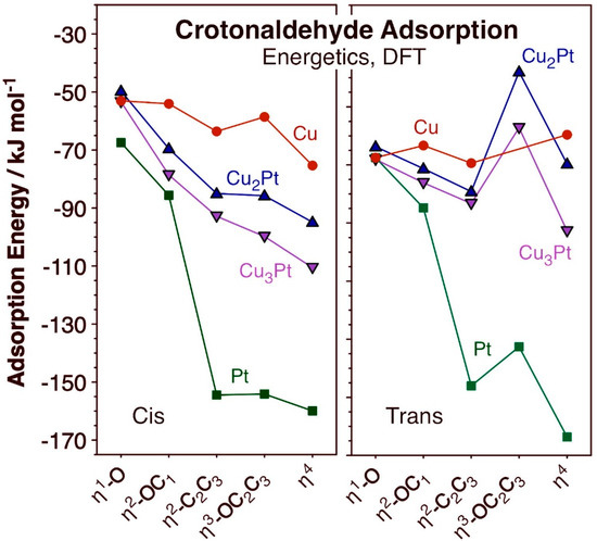 Indeed, what we found is that the presence of Pt atoms leads to a preference for multiple coordination of crotonaldehyde to the surface. On pure Cu, the adsorption energy is not very sensitive to additional interactions between any of the carbon atoms of crotonaldehyde and the surface [66], but on pure Pt, multiple coordination leads to much stronger binding [66,69], and the data reported here indicate that the same is true with the Cu-Pt alloys. For one, in all η2-OC1 and η2-C2C3 configurations, the carbonyl and C=C groups of crotonaldehyde (respectively) both bind across a Cu–Pt bridge, with the O atoms placed on the Cu atoms and the C bonded to the Pt in the first case (Figure 2). Moreover, and more significantly, the more extensively coordinated η3-OC2C3 and η4 adsorptions show binding with both carbonyl and C=C groups, which make those species significantly more stable: the carbonyl group still binds with the O atom attached to Cu, but the C=C bond is π-bonded to a single Pt in the case of the more stable cis isomers (the trans isomer, with its weaker adsorption energies relative to the cis form, binds in a di-σ mode across a Cu–Pt bridge instead). The bottom line is that, if Pt is present on the surface of the alloy, even in single-atom form, that atom is likely to participate in the binding of the reactant, crotonaldehyde in this case. It must be concluded that, in addition to aiding in the activation of molecular hydrogen, the addition of Pt to Cu surfaces is likely to also affect the hydrocarbon hydrogenation steps. An indirect kinetic evidence for this conclusion was already obtained by us before for the case of cinnamaldehyde: both the equilibrium constants for the adsorption of the reactant and products and the reaction constants for the hydrogen incorporation steps were seen to vary with alloy composition in the CuPtx/SBA-15 catalysts, some by up to three orders of magnitude [54].